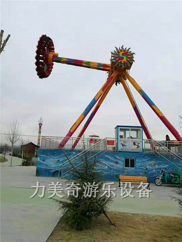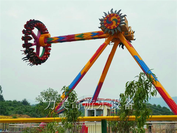大擺錘又叫流星錘、大擺錘,是一種旋轉(zhuǎn)類的大型游樂設(shè)備,其運動原理是由時鐘鐘擺引發(fā)而來,運動軌跡也是鐘擺形式,大臂下面帶有一個圓盤,在大臂做鐘擺擺動時,大臂下面的圓盤同時在做旋轉(zhuǎn)運動,游客乘坐在旋轉(zhuǎn)的大擺錘上往復(fù)擺蕩,失重感令人目眩神迷;游客往往情不自禁的發(fā)出驚呼與歡笑,極大的提高了整個游樂場的歡樂氣氛,使許多游客留連忘返,遲遲不愿離去。