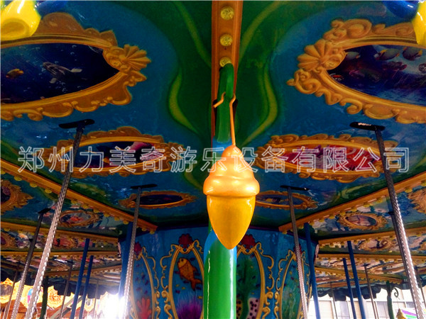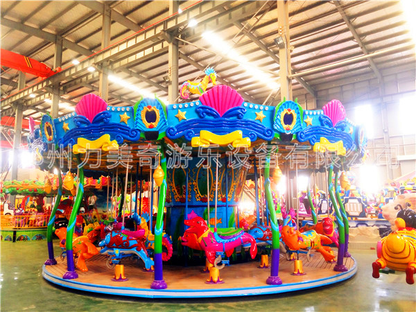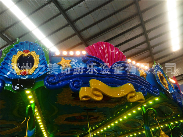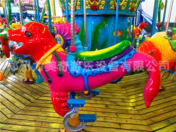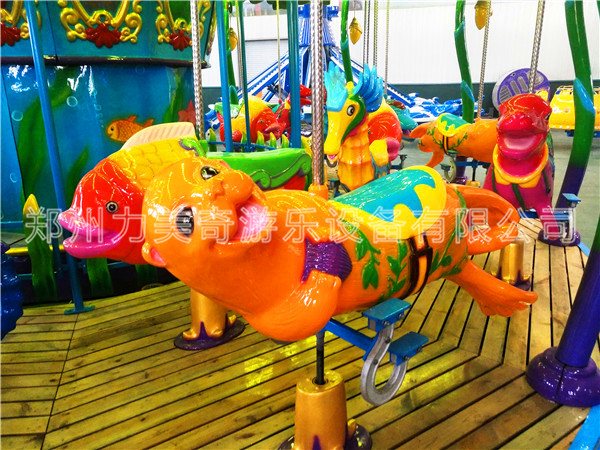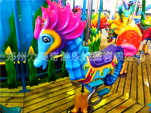 海洋款豪華轉(zhuǎn)馬,靜謐的珊瑚世界、奇幻的深海傳奇、冒險(xiǎn)的海洋生物,浪漫和驚喜的海洋,當(dāng)轉(zhuǎn)馬開始旋轉(zhuǎn)時(shí),乘客乘坐在色彩斑斕,形態(tài)各異的海洋動(dòng)物上奔騰跳躍,暢游深海,仿佛置身仙境般的海洋童話世界,精靈般的夢(mèng)想由此開始向無窮的天際放飛,睜大孩子們羨慕的眼光,讓音樂離場(chǎng)。